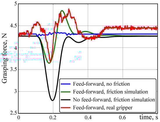 The actual grasping force transient processes in all simulated cases are shown in Figure 8. As it can be seen, force sag during rotation without the use of feed-forward channels reaches up to 35% of the set point. In the case of friction simulation, this sag can be decreased down to 15%, making grasping force control precision suitable for a wide range of industrial applications. In ideal case with no friction, force error can be minimized below 5% of the set point.
