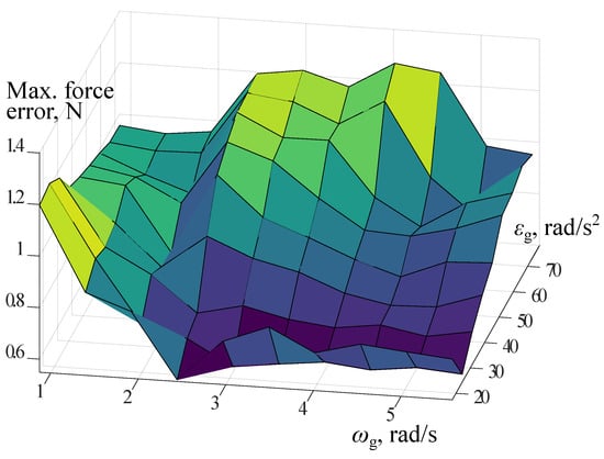If we analyze the dependency of the force error from rotation acceleration and velocity (Figure 9), it can be seen that it reaches its maximum values while moving with medium and low velocities. Moreover, one of the surface peaks is near the point corresponding to the lowest acceleration and velocity. This can be explained by friction being the main source of the grasping force error. This hypothesis is also supported by previously obtained experimental results (Figure 8). It is worth mentioning that real experimental results match simulated ones. The model used for simulation did not consider cardans’ backslashes and telescopic shafts torsion. Neither of these factors had any significant impact on the behavior of the real gripper during the last experimental series, which included more than 1500 consequent grasps and rotations. This supports the above statement that the proposed controller minimizes the influence of backslashes and shafts’ torsion. As a result, friction can be considered a critical factor in reducing grasping force precision, and its reduction is the primary goal of designing an industrial version of the proposed gripper.