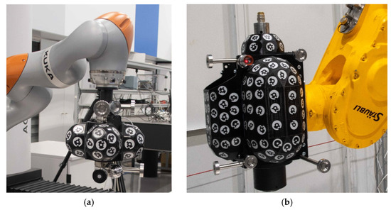 Two different trackable objects have been used; both have been adapted to the end-effector of the robot (see Figure 3). In both cases, coded targets cover the end-effector using a 3D-printed structure to generate semispherical shapes. In this research, we placed the maximum number of targets, and this number will be optimized to reduce the quantity in the future.