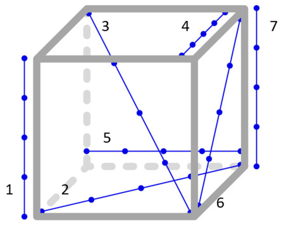 Layout of the 7 bars in cubic volume (image adapted from VDI/VDE 2634 part 1).The blue line are the bars and the dots are the points where is measured.
