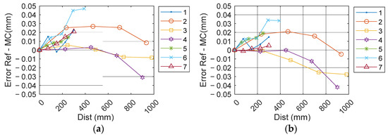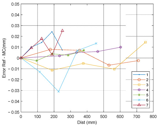 As Figure 6 illustrates, the deviation of the MC with respect to CMM, when the reference points are measured by CMM, is between −0.031 mm and 0.026 mm. Table 2 shows the results of using the different references. The best results are obtained using CMM, but with the same maximum LME as LT. In turn, when using PP, the results obtained show the difference, but the values (LME Maximum 0.049 mm) are acceptable because the aim is less than ±0.2 mm.