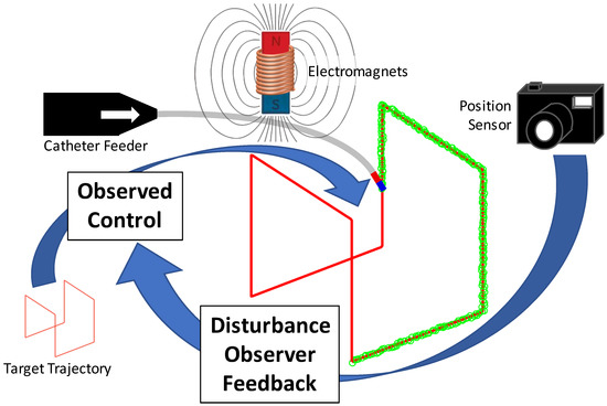 Magnetic catheter system diagram. The observed control algorithm generates magnetic and insertion controls to achieve the target trajectory. Closed-loop control is provided by a disturbance observer using visual feedback [6,7].
