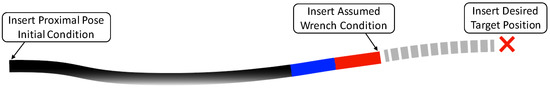 The catheter used in this application includes two segments: a proximal flexible segment followed by a distal magnetic segment. It is diagrammed in Figure 2 in the observed control configuration. In our system, proximal pose and distal wrench boundary conditions are known. The proximal pose is an initial condition where the catheter exits the feeder. The distal wrench is assumed zero, as the rod is operating in free space. Distal wrench will be inserted as an assumed condition with low covariance. Inserted at the distal end of the catheter is a fictitious desired position condition with low covariance to convey its certainty. Using this setup, controls can be found for the catheter to achieve the desired distal position using observed control.