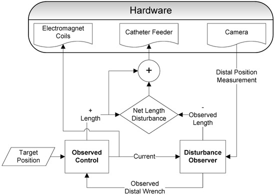 Here we propose steering a flexible magnetic catheter using a new approach named observed control, which employs the well-established Kalman smoother framework to perform model-based predictive control. As shown in the Figure 1 system diagram, we use observed control to predict open-loop inputs to position the catheter tip on the desired trajectory. A disturbance observer uses positional feedback to calculate model disturbances that explain trajectory error. Finally, controls are applied to correct for these disturbances, resulting in closed-loop control of an extensible magnetic catheter.