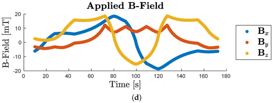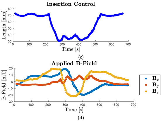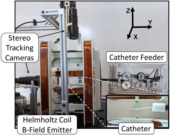 The catheter manipulation system used in this paper includes a nested Helmholtz coil system that generates a homogeneous 3D magnetic field and a feeder device that moves the catheter through tensioned rollers for linear insertion and retraction, as seen in Figure 4. The Helmholtz coil produces a field in any direction up to 43 mT in the 140 × 140 × 50 mm workspace, and the feeder inserts the catheter up to 5 mm/s. For a detailed description of this system, see [41]. Note that the visual position feedback and catheter design differ from [41] and are described below.