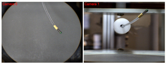 Two BFS-U3-51S5C cameras (Point Grey, Richmond, BC, Canada) provide stereo visual feedback for 3D catheter tracking at 30 Hz. The world frame distal position of the catheter is identified using color tracking from the OpenCV library [42] on the green-painted magnetic tip. Camera calibration is performed before testing to generate the transform from image frame pixels to world frame meters. The 480 × 402 pixel images correspond to a 100 × 84 mm overhead field of view at the bottom of the workspace, resulting in a pixel resolution accuracy of about 0.2 mm.