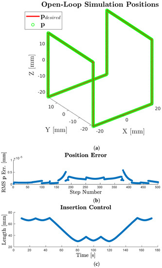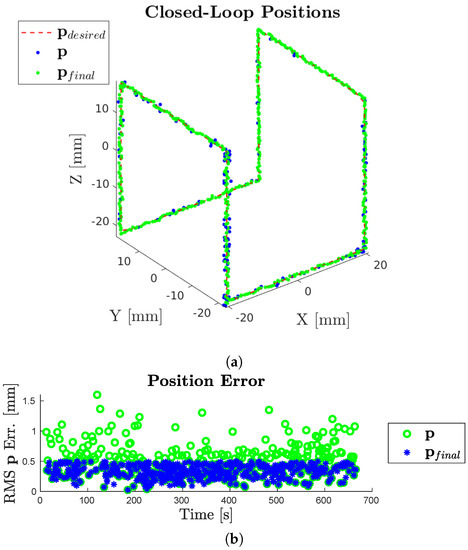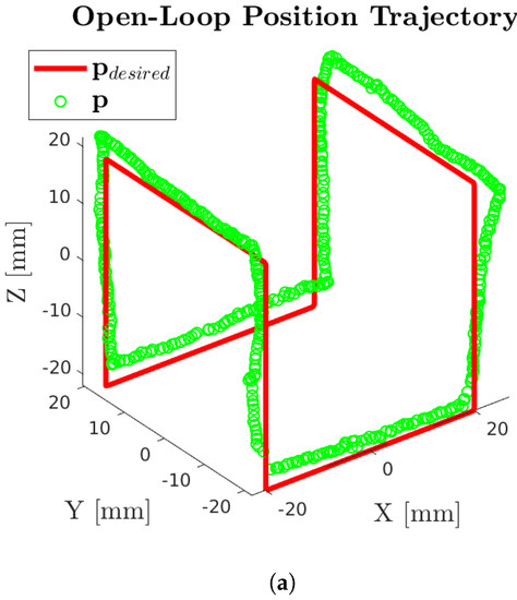 The cube trajectory is executed in open-loop to examine how accurately the model reflects reality. The trajectory is then executed in closed-loop to evaluate the accuracy achievable given positional feedback. Videos corresponding to each experiment are available in the Supplementary Materials. The open-loop trajectory is shown in Figure 7. The catheter followed the trajectory with an average RMS position error of 4.6 mm, and a maximum error of 10.5 mm (Table 4). In the closed-loop trajectory, all final positions achieved the desired 0.5 mm error tolerance, as shown in blue in Figure 8a,b, with an average error of 0.33 mm. Figure 8 also shows the converging closed-loop trajectory points in green, with an average error throughout the trajectory of 0.39 mm, and a maximum error of 1.60 mm.