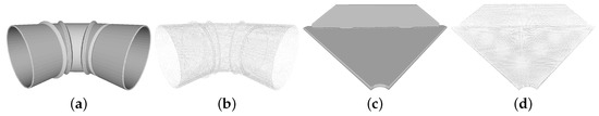 Use-case objects: (a) 90-flow-pipe CAD model, (b) 90-flow-pipe point cloud, (c) triangular-wall-support CAD model, (d) triangular-wall-support point cloud.