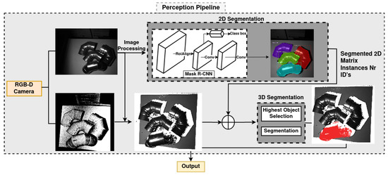 In this Section, we detail the full perception pipeline, from receiving the initial inputs to the segmented point cloud acquisition, describing the development of each process. The process of object segmentation is based on deep learning detection and point-cloud-segmentation methods and is responsible for detecting, selecting, and segmenting the best object to grasp, according to specific heuristics, such as the highest object, or the object segment with the most surface area, as briefly depicted in Figure 4 (adapted from [30]).