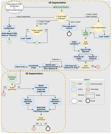 The proposed approach is detailed in Figure 5, which depicts the system divided into two main algorithms, namely, 2D segmentation and 3D segmentation. The approach was implemented through a ROS action server, which receives goals from the client (mobile platform) and transmits results and feedback.