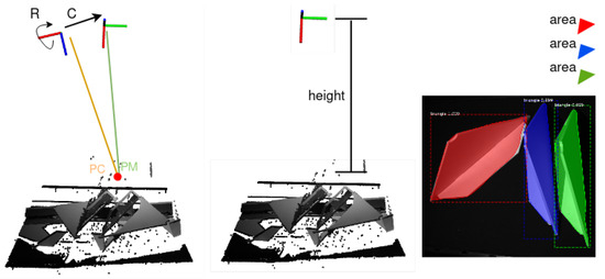 Later on, the point-cloud coordinate system is transformed from its camera optical frame to the sensor body frame, which is parallel to the bin. This is necessary because the Photoneo 3D scanner relies on structured light sensing, and as such, requires overlapping fields of view between the camera and the laser projector. For achieving this overlap, the scanner has the camera tilted 15 in relation to the sensor’s body frame. This tilt must be taken into consideration for ensuring that the height measurements are properly made on frame M instead of frame C, as shown in Figure 6. As observed, the z axis of frame C has a 15 tilt, requiring a change in the coordinate system (represented in Equation (1)), which changes the original frame to the corrected frame, converting the z axis of frame C to the x axis of frame M and transforming point coordinates (X, Y, Z) to (X, Y, Z).