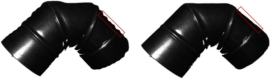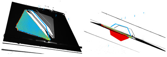 Taking into consideration Table 10, for every experiment realized in this paper, the majority of the failures were caused by the matching process, generally when applied to the triangular-wall-support model. Several of the matching failures originated because the smaller surface of the triangle was directed upwards, causing the RGB-D sensor to be perpendicular to this smaller surface, thereby only segmenting the top view, as exhibited by the straight line in blue in Figure 20 (Left). As a result, in some cases, the matching algorithm estimated the object in the opposite direction, as shown in Figure 20 (right), where the CAD model (red) is in the opposite direction of the segmented cloud (blue). The same happened with the first experiment, exhibited in Table 7, where most of the total failures (87.5%—portion of matching failures of total failures) were caused by this error. However, this error did not appear because of the segmentation, but rather because of the perspective of the robot manipulator. The solution for this problem is to acquire data from different perspectives, acquiring point clouds with more information about the object being scanned.