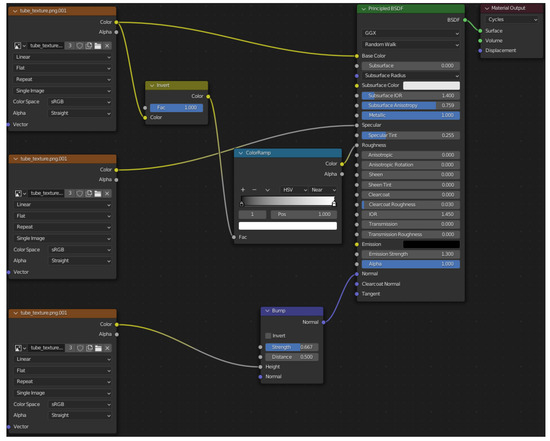 The proposed simulated-data-generation system is divided into two stages: first, an offline phase (also referred to as configuration), executed before performing any actions; second, an online phase, executed while the algorithm is running. The offline stage is required to configure the types of objects, object quantity, view perspectives, and render configurations. For instance, the render engine used was Cycles, computed with an RTX 3080 graphics card with CUDA 11.4 installed. For each model, there was a texture configuration with similar configuration attributes, as illustrated in Figure 8, but with different parameter settings and input texture images. Beyond the realistic texture, different colors are defined based on the maximum number of items the user requires in the scene. For instance, if the user demands a maximum of 10 objects, 10 distinct colors were defined, with fixed RGB values.