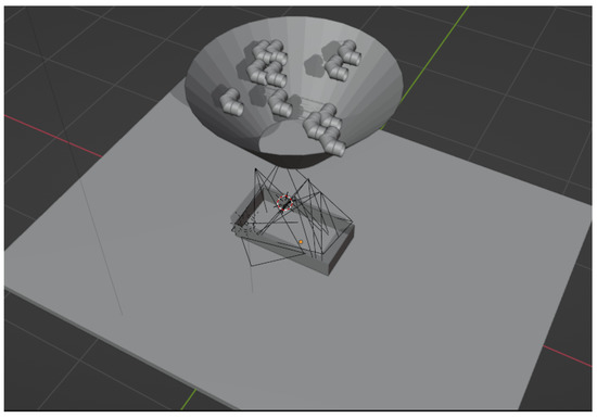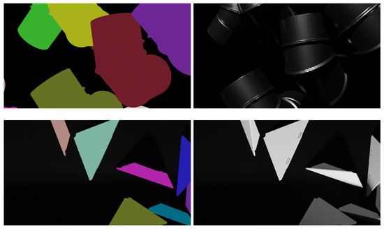 The online stage begins by activating rigid-body physics properties, enabling gravitational and object collision forces. The generation simulation loop starts by associating each object with a predetermined color. Then, as shown in Figure 9, the objects are positioned on top of a funnel with a random pose, falling into the desired bin with various positions and orientations. Subsequently, two different scenes are rendered. The first one has the respective colors, thereby generating objects with constant color values regardless of position, orientation, and illumination system; and the second scene has the selected object’s texture, with realistic settings (each loop supplies two images for each viewing perspective).