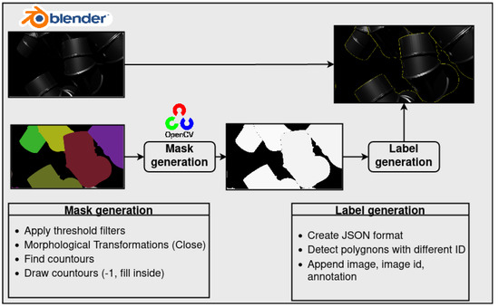 Finally, the information of each image was collected into one file in JSON format, ending with the original simulated dataset generated in Blender and the annotation file. Each segment of the entire dataset was labelled. Each image has its own polygon segments labels, as displayed at the output of Figure 11.