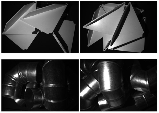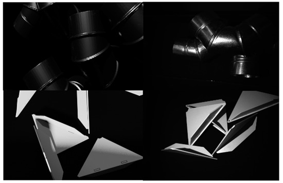 To support the development of the proposed bin picking system, a use-case from the shipbuilding industry was considered. We focused on improving the image segmentation process, which currently is the main bin-picking bottleneck. It is composed of two object models, a 90 flow pipe (Model A) and a triangular wall support (Model B), illustrated by the CAD models depicted in Figure 2. These models are very different from one another, covering various features. Model A is made of reflective material, which can lead to a number of visual issues, especially when applied in an environment with a variable illumination system, as exhibited in this case. Model B is composed of a textureless material, which causes several difficulties in object detection, as detailed in [28], because the deep neural network has to analyze fewer features. In addition, when demonstrated in cluttered scenarios, there are some instances where the height difference between objects is close to zero, making it challenging to select the appropriate objects to grasp.