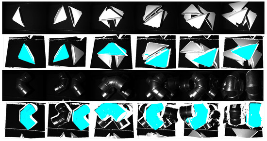 Figure 18 displays several segmentation results acquired from bin-picking experiments with the two referred models (90 flow pipe and triangular wall support) containing from 1 to 6 objects. The segmented point cloud estimated by the object segmentation system is represented by the blue region. As observed, the segmentation system only selects the object most appropriate to be grasped by the robot manipulator. Considering these results, every segment was correctly estimated, though with a small mask error in some of the triangular-wall-support model segmentation.