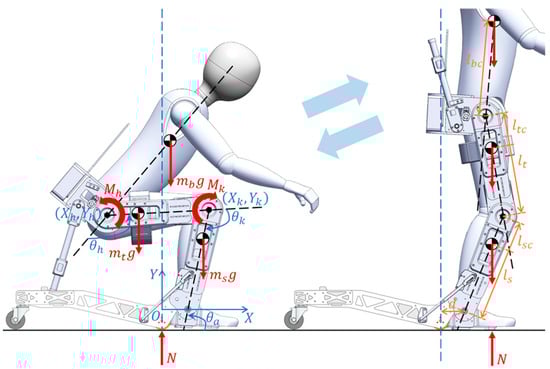 The wheelchair–exoskeleton hybrid robot can transform from sitting to standing configurations on the sagittal plane, as shown in Figure 1. Trunk flexion (increasing the hip angle ) is necessary to move the body’s center of gravity forward over the front wheels (pivot point) to prepare for standing up. The ground-contacting point is shifted from the rear caster wheels to the feet during this transition. By creating the knee extension moment , the whole body is lifted upward. As the knee is extended (the knee angle decreases) adequately, the hip extension moment is required to align the upper body in an upright posture (the hip angle decreases). The ground reaction force is now located anterior to the front wheels to maintain the equilibrium in the standing configuration. The pair of chair legs is rotated upward, and the left and right wheel modules are retracted to prepare for walking.