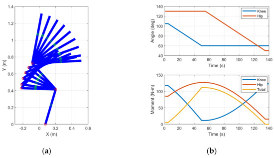 Simulated sit-to-stand motion: (a) Simplified kinematics of sit-to-stand motion in our study. The ankle, knee, and hip joints shown by the red markers connect the shank, thigh, and body links. The links’ CGs are shown by the green makers. The origin of the plot is the intersection between the horizontal line crossing the ankle joint and the vertical line crossing the front wheel center; (b) Simulated knee and hip angles are plotted in blue and orange, respectively. The total duration of the sit-to-stand motion is approximately 2 min for this quasi-static simulation. The estimated knee and hip extension moments are plotted in blue and orange, respectively, and the total clockwise moment computed via Equation (6) is plotted in yellow.