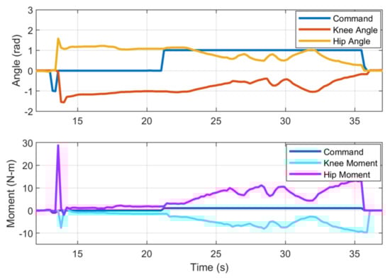 The results in Figure 7 show the angle and moment recorded from the knee and hip motors of the exoskeleton’s right leg during the experiment. In the blue plot, command −1 (at 13.2 s) indicates the user’s intention of receiving the knee and hip extension moments supporting the sit-to-stand motion. The knee angle (orange plot) decreases from 0 rad to −1.54 rad (the motor rotates CCW) in less than 1 s. Simultaneously, the hip angle (yellow plot) increases from 0 rad to 1.54 rad (the motor rotates CW). In consideration of the moments, the peak torque magnitude of the knee motor (cyan plot) reaches 7.5 N·m, whereas that of the hip motor (magenta plot) reaches 29 N·m. After standing upright, the command 0 (at 13.6 s) is sent by the user. The stiffness of the knee and hip joints are set such that the motors behave as torsion springs with the equilibrium positions corresponding to the standing posture. The motor stiffness is sufficient to compensate for the weight of the exoskeleton’s structure. The magnitude of torque when command 0 is sent (from 13.6 to 21.2 s) is related to each motor’s displacement from its equilibrium. The command signal +1 is sent (from 21.4 s) to evaluate the assistive performance with the virtual spring concept. While maintaining the equilibriums of the motors at the standing upright posture, the higher stiffness is now set to the motors, as can be observed on the basis of the higher torque-to-displacement ratios during the three cycles of squatting. During stand-to-sit motion (from 32.0 s), the magnitudes of the knee and hip angles converge to the original angles before standing, whereas those of the torque increase with the motors’ displacement measured from their equilibriums in the standing posture.
