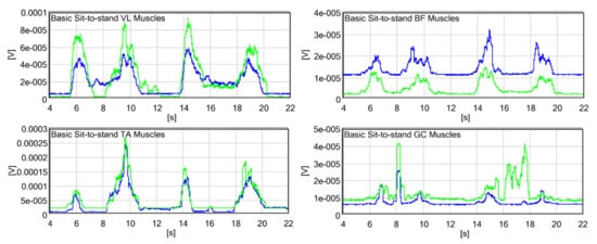 RMS electromyography (EMG) of the right (blue) and left (green) muscles recorded during the basic sit-to-stand test (without wearing the exoskeleton).