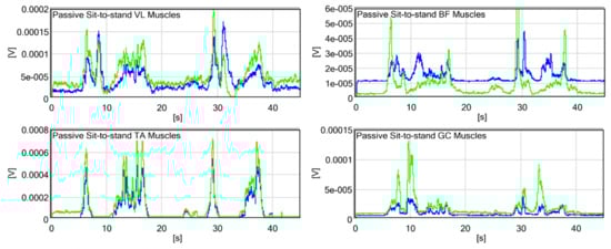 RMS electromyography (EMG) of the right (blue) and left (green) muscles recorded during the passive sit-to-stand test (without actuation).