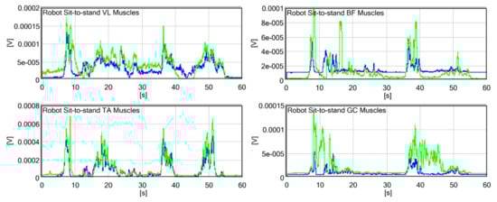 RMS electromyography (EMG) of the right (blue) and the left (green) muscles recorded during the robot sit-to-stand test (with knee extension support).