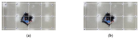 Markers are attached to the floor in a 5 × 3 array: (a) Original recording with distortion from wide lines; (b) Recording processed via OpenCV to yield the 4 × 2 m reference grid.