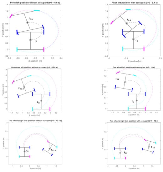 Examples of the wheelchair turning trajectories with/without the occupant during pivot left turns, one-wheel left turns, and two-wheel right turns. Blue markers indicate the front driving hub motors. Black, cyan, and pink markers and curves represent the wheelchair–human’s CG, left, and right caster wheels, respectively.