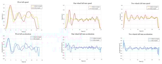 The magnitudes of the CG’s velocity and acceleration are estimated and plotted in Figure 14. As a result of the PID control, the damped vibration response to the step reference can be observed in the velocity plots. In all scenarios, the settling times appear to be smaller without the occupant. The lower inertia system (without the passenger mass) is advantageous when the limited control input (driving torque of the hub motors) is considered. The effect of the occupant on the response delay is notable during turning with one wheel, which corresponds to the delay in caster steering. The lower percentages of the maximum overshoot are observed during turning with both wheels.