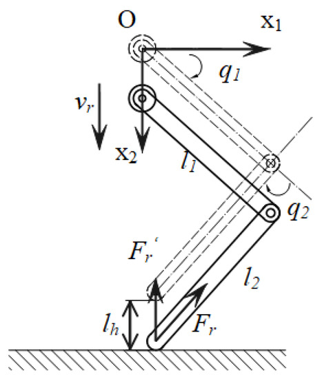 When analyzing the contact impact force, firstly, the mechanical model of the contact between the leg and ground was established. Additionally, the structure diagram of the robot leg’s forward direction is shown in Figure 1. The leg structure of the robot can be seen as a rigid body. The leg’s forward direction has two coaxial rotating joints, respectively, the forward direction hip joint and the knee joint. The joint angle of the forward direction hip joint is q1, and the joint angle of the knee joint is q2. The other parameters of the model are shown in Table 1.