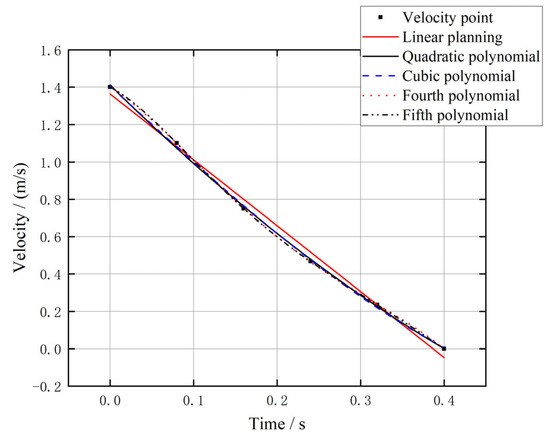 It can be seen from the curves in Figure 2 that the primary linear curve cannot meet the requirements of the initial and final values. The quadratic polynomial meets four velocity points. The cubic polynomial, fourth polynomial and fifth polynomial are relatively close and can meet all velocity points. In order to simplify the planning process, we selected cubic polynomial for planning. Additionally, the cubic polynomial is defined by Equation (11):