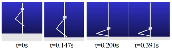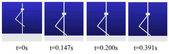 The revolute pairs were added to the positions of hip with thigh and thigh with shank. Additionally, the revolute pairs’ friction coefficients were set as the default value. The initial falling height was 100 mm, and the gravity acceleration as the default direction was the negative direction of the global coordinate system Y. The screenshot of the simulation test process is shown in Figure 4 and Figure 5; Figure 4 is a screenshot of the simulation test with buffer process, and Figure 5 is a screenshot of the simulation test without buffer process. At t = 0 s, the robot is at 100 mm from the ground; at t = 0.147 s, the robot foot contacts the ground and at t = 0.391 s, the robot buffer process ends.