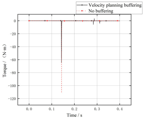 We can find the joint torque in Figure 6, and we can see that the peak of velocity planning buffering is lower than with no buffering. So, we deemed that the peak torque had been optimized and the velocity buffering was effective. The peak of velocity planning was 0.5830 times of the peak with no buffer. The velocity and angular velocity of the knee joint was used to guide the experiment.