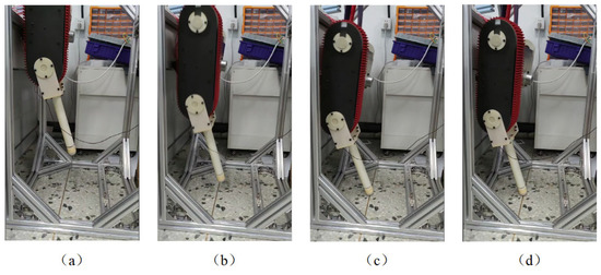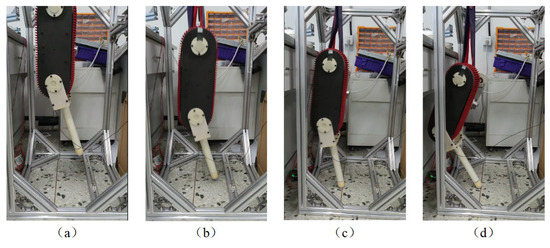 The final experiment tested the velocity planning buffer. The process of the experiment was to relax the elastic rope to make the one leg fall freely; the elastic rope could only maintain the balance within the single-leg roll plane. The experiment was divided into one with buffer experiment and the control group without buffer experiment, as shown in Figure 10 and Figure 11. First, we lifted the single leg up to the preset height (which was same as the simulation model height, 100 mm) by lifting ropes. Then, we unlashed the lifting ropes and the single leg began to free-fall. We tested twice. In the first test the single leg contacted the ground with no buffer. Additionally, in the second test the single leg contacted the ground with the velocity planning buffer strategy. The process of no-buffer contact is shown in Figure 10 and Figure 10a is the single leg in lifting. Figure 10b is the state of free-fall, Figure 10c is the moment the single leg contacted the ground and Figure 10d is keeping contact and the leg with no buffer. The process of the velocity planning buffer contact is in Figure 11; Figure 11a,b is same as Figure 10a,b, Figure 11a shows the leg lifting and Figure 11b shows the leg in free-fall state. Figure 11c is the moment the single leg made contact with the ground and the knee joint began to revolve (the angular velocity set as simulation results). Figure 11d shows the single leg finish the velocity buffer strategy.