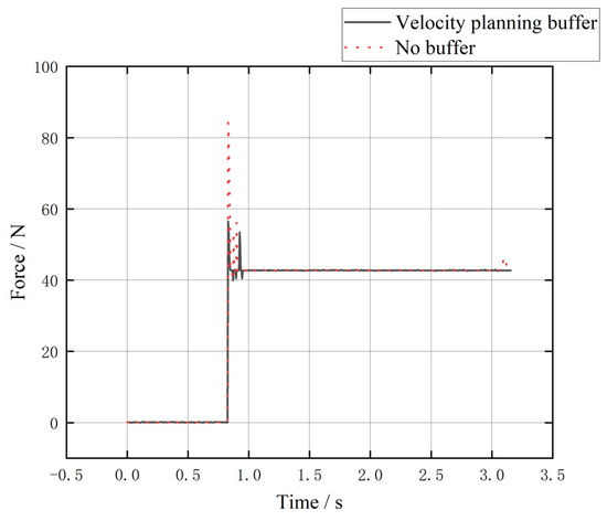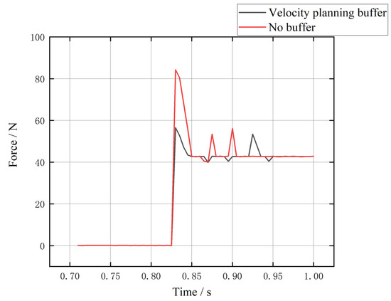 The data of the foot end pressure pickup in the experiment are shown in Figure 12, 0 s to 0.825 s, showing the leg in the lifting and free-fall. The contact happened at 0.825 s, and from 0.825 s to 1.0 s the leg was in the course of buffering. From 1.0 s to 3.2 s the leg continued contact with ground. The meaningful part of the experiment was included in the 0.7 s to 1.0 s, so we show the part’s data in Figure 13. The single-leg experimental bench produced a large instantaneous impact force with no buffer contact moment, the same as expected from the pulse dynamics of the simulation. After introducing the buffer strategy based on speed planning, the contact instantaneous impact had obvious optimization. The velocity planning contact force was 0.671 times that of no-buffer, because the simulation model parameters set in motion vice static friction. The friction coefficient setting had certain differences with the actual experimental bench, so the results are not exactly the same, but the force change trend was similar. The test results show that they are confirmed our expected outcome from the simulation.