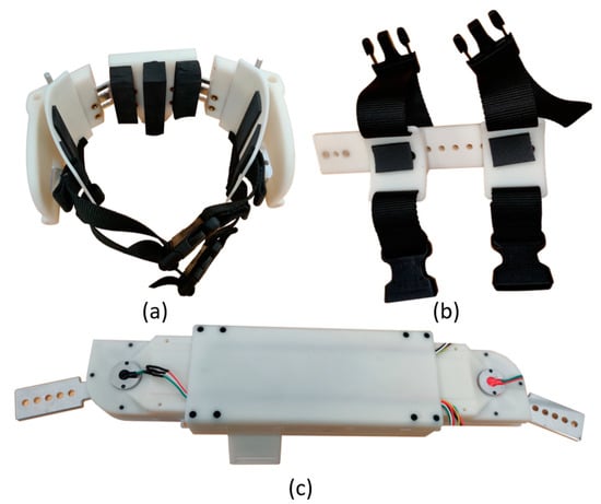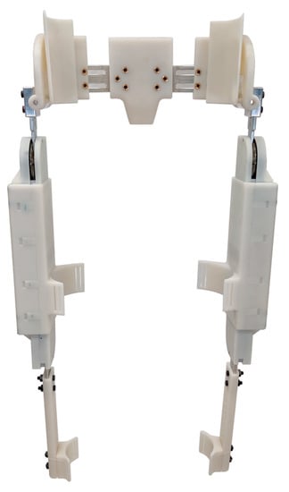 Several adult-oriented exoskeleton devices have been developed to assist individuals with gait impairment resulting from incidents such as stroke and spinal cord injury. Many exoskeleton devices such as the EksoNR by Ekso Bionics [3,4], the ReWalk Robotic exoskeletons [5], the Hybrid Assistive Limb by Cyberdyne [6], the Indego exoskeletons by Parker Hannifin [7], and the Rex Bionic exoskeleton [8] have even received FDA approval or CE Mark [9,10]. However, while the field of adult-oriented medical exoskeleton technology has been steadily expanding, there is significantly less development in the field of pediatric-oriented exoskeleton devices [11]. Pediatric individuals also deal with gait impairments which often stem from various genetic, neuromuscular, or neurological development disorders such as cerebral palsy [12,13], muscular dystrophy [14], or spina bifida [15]. The development and design of a pediatric-oriented exoskeleton for these individuals necessitates several additional design considerations relative to adult devices. This includes the ability to accommodate and easily adjust to a larger range of possible anthropometric parameters, the ease at which a child can don and doff the device, a significant limitation on the acceptable device weight and size, and other desirable characteristics such as device mobility and usability. Several robotic walking devices such as the Lokomat [16,17] and the Walkbot-K [18] are attached to instrumented treadmill systems. Other exoskeleton devices such as the Trexo Home [19] and the CPWalker [20] are attached to external stability structures or devices. These additional structures limit the device’s mobility in community settings and their ability to accomplish other activities of daily living outside of walking tasks. Other devices actuate only a single degree of freedom, such as the knee exoskeleton [21,22] and the ankle exoskeleton [23] developed by Lerner et al. The Marsi Bionics Atlas 2020 and 2030 exoskeletons lie on the other end of the actuation spectrum with 10 actuated degrees of freedom. However, this high degree of actuation results in a large device weight of 12 kg [24,25], representing a significant burden on a child wearer. The 2S-HAL by Cyberdyne shows great promise as a lightweight pediatric device [26,27], though the device’s speed of adjustability, ease of use, and power capabilities remain underreported. The P-Legs device [28] by Eguren et al. is both mobile and lightweight. However, the need for customized 3D printed braces for each intended user ensures that the exoskeleton braces will need to be reprinted several times over the course of the wearer’s growth. In situations where a single device must be used across multiple wearers, multiple braces must be prefabricated, and the device must be repeatedly disassembled and reassembled for each new wearer. This represents a significant increase in reconfiguration time, which plays a critical role in the average 30 to 60 min long physical therapy session [29]. Additionally, the need to pre-fabricate the customized braces for each individual can significantly inflate the cost of using the device. The anthropometrically parametrized exoskeleton by Laubscher et al. [30] suffers from similar limitations due to its customized 3D printed exoskeleton frame. To the authors’ knowledge, there does not seem to be a suitable exoskeleton that addresses the needs of the pediatric population while remaining mobile, lightweight, quickly adjustable, and easy to don and doff.