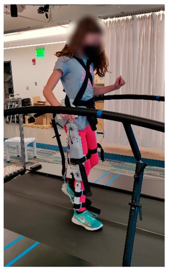 Once the child was wearing the exoskeletal device, they were tasked with walking on an instrumented treadmill for 6 min at a comfortable self-selected speed. An R-Mill instrumented treadmill (Motekforce Link, Amsterdam, The Netherlands) was used for these walking tasks. The treadmill included a parallel bar structure to assist with lateral balance and an optional overhead harness system to safely suspend the participant over the walking surface in the unlikely event of a fall. The experimental setup is shown in Figure 3. After the 6-min walking test, the researchers conducted an inspection of both the device and the child participant while under the parent/guardian’s supervision. The purpose of this evaluation was to determine if continued and concurrent motion with the exoskeleton system would introduce any uncomfortable points of contact between the wearer and the device. The walking test also revealed if the exoskeletal frame would sustain any wear or damage during operation that would necessitate hardware adjustments.