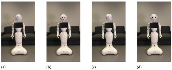 We implemented two different stories using the robot Pepper [] and the software Choregraphe [] version 2.5.10.7. For the technical content, we chose How do robots work? (https://courses.reaktor.education/de/courses/emerging-technologies/robotics-and-automation/how-do-robots-work/, (accessed on 31 August 2022) which was translated to German and simplified in terms of content and speech, whereas the story Die Maus, die sich fledermauste [] (The mouse which became a bat) was used for the social content conditions. Both stories were implemented using a speech rate of 85 and autonomous robot behavior, such as random blinking and idle movement. Since gestures matching the spoken text would enormously differ between the two texts, none of the stories was accompanied by gestures to avoid side effects elicited by differing movements. Two videos were recorded per story, one with a visible cable and one without, resulting in four video stimuli of approximately four minutes. At the beginning of each video, Pepper stood facing sideways and turned its head to a centered position after the start, as displayed in Figure 1. As soon as its gaze was directed at the camera, it began to speak.