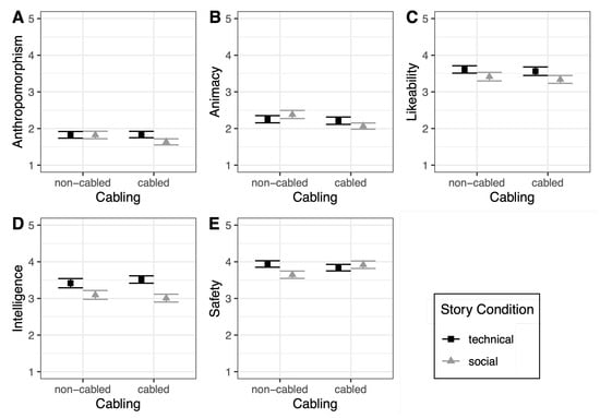 Means and standard errors for perceived anthropomorphism (A), animacy (B), likeability (C), intelligence (D), and safety (E) as a function of cabling (i.e., non-cabled vs. cabled) and story content (i.e., technical vs. social).