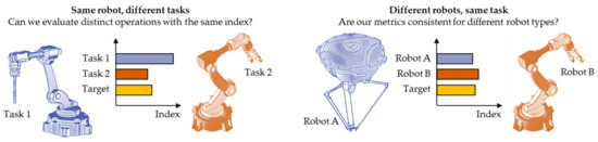 The need for unified performance metrics is here explained with two examples. In the first one, we need to evaluate the performance of a robot during two different operations; without a standard set of metrics across different applications, it is difficult to estimate which task the robot is more suited to. In the second example, two different robots are both able to perform similar operations. Selecting the best robot, however, could be challenging if the formulation of the chosen performance index, or the experimental procedure to evaluate it, changes according to robot architecture, geometry, or motion parameters.