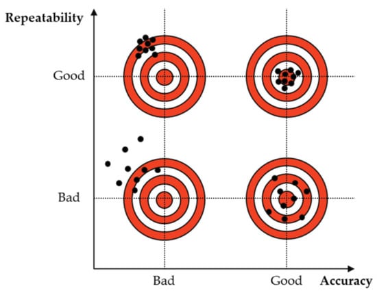 A graphical representation of accuracy and repeatability in a task that requires hitting the center of a target: a low accuracy results in points being far from the center, whereas a low repeatability increases the area in which points are scattered.