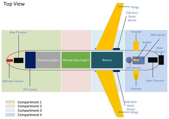 The HAUG is designed for two main modes: AUG mode and AUV mode. The AUG mode uses two main actuators: a buoyancy engine and a moving-mass engine. The moving-mass engine is used to control the pitch and the buoyancy engine is used to control the heave motion. Under certain conditions, the two engines produce a longitudinal motion. In AUV mode, the HAUG uses two main actuators: three propulsion-based thrusters (main, bow, and stern thrusters) and surface controls (rudder and elevator). The thrusters control the surge, yaw, and sway motion, while the elevator and rudder control yaw and pitch. Figure 1 shows the HAUG’s mechanical design with a modular design. The modular design consists of four compartments. The first compartment consists of the bow thruster, altimeter sensor, and Doppler velocity log (DVL) sensor. The second compartment consists of a moving-mass engine. The third compartment consists of the battery, wing, and charge sensor (side-scanning sonar sensor). Finally, the last compartment consists of the elevator, rudder, Global Positioning System (GPS) sensor, inertial measurement unit (IMU), stern thruster, and main thruster. Figure 2 shows the given design and Figure 3 shows the underwater prototype HAUG. The HAUG has a combination of glide movement capabilities on the sea glider in glide mode and propeller-based movement (propulsion) in AUV mode. The glide mode utilizes the ability of the buoyancy engine to control the HAUG’s buoyancy for movement, while the AUV mode utilizes propulsion and surface control for manoeuvring and movement.