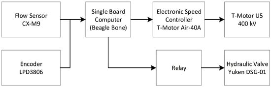 The block diagram in Figure 5 shows the electronic diagram to control the buoyancy engine. The CX-M9 sensor, a micro flow sensor from Shanghai Cixi Instrument-Shanghai, China, measures the hydraulic oil volume which is pumped from the internal bladder to the external bladder and vice versa. This sensor has a 5 mL/pulse resolution with 6–600 L/h and 0.2% in full-scale accuracy. The LDP3806 sensor is an Optical Rotary Encoder from Domoticx-Mariënheem, Netherlands which is used to measure the rotation per minute of the U5 motor. The U5 motor is a 24 V brushless from T-Motor-Nanchang, China, with a maximum of 7000 rpm at 30 A. The proposed design used a Hydro Leduc PB36.5, a hydraulic pump from Hydro Leduc-Azerailles, France, with a maximum of 6000 rotation per minute and a maximum pressure of 5075 Psi. Moreover, to control the direction of the hydraulic oil flow, the buoyancy engine uses a Yuken DSG-01 hydraulic valve, a 4-way and 3-position valves from Yuken Sea-Bangkok, Thailand.