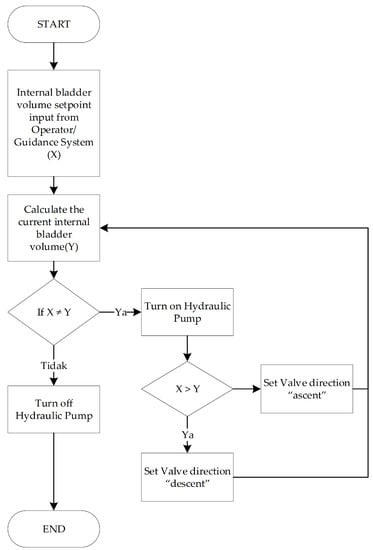 The buoyancy engine workflow is shown in Figure 6. The buoyancy engine receives information from the operator or guidance system. The information is in the form of a desired internal bladder volume (X). The BeagleBone Black, a single board computer from BeagleBoard.org-Michigan, USA, evaluates the current volume of the internal bladder (Y) and the difference from the desired internal bladder volume (X). If the internal bladder volume (Y) is more than the desired internal bladder volume (X), the BeagleBone Black commands an action. The action is to run the hydraulic pump motor and relay to open the hydraulic valve according to the flow and desired volume. However, if the desired internal bladder volume (X) is less than the internal bladder volume, the BeagleBone Black gives the same signal with a different flow direction.