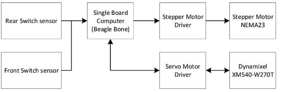 The design of this moving mass consists of two motors and a single moveable mass that can move linearly and rotate. The first motor uses a NEMA 23, a stepper motor from Soya Motor-Changzhou, China, with a detent torque of 70 mN·m and a holding torque of 1.3 N·m. This motor can move a moveable mass weighing 4 kg in a linear direction. The second motor uses a Dynamixel XM540-W270T, a servo motor from Robotis-Seoul, South Korea, with a stall torque of 10.6 N·m and a resolution of 4096 pulse/rev. This motor can move the moveable mass and all components of the holder weighing 7 kg. In addition, this prototype uses two mechanical switch sensors that are placed at each end of the movement space. The function of this mechanical switch sensor is to mark the limit of the movement of the moving mass. Moreover, this prototype processes information from the mechanical switch sensors and position sensors in the Dynamixel XM540-W270T on the BeagleBone Black to determine the current position and give instruction to move the moveable mass to the desired position. The block diagram in Figure 9 shows the electronic diagram to control the moving-mass engine.