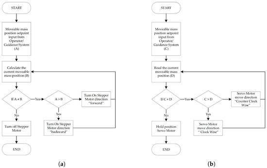 The moving-mass engine workflow in the longitudinal axis is shown in Figure 10a. The moving-mass engine receives information from the operator or guidance system. The information is in the form of a desired pitch/roll (A). The BeagleBone Black evaluates the current position of the moveable mass (B) and the difference from the desired position (A). If the difference between the position of the desired moveable mass (A) and the current position of moveable mass (B) is more than the tolerance value, the BeagleBone Black signals a command to turn on the stepper motor. If the position is smaller, then the BeagleBone Black signals to turn on the stepper motor in a “forward” motion. Meanwhile, if the position is greater, then the BeagleBone Black gives a signal to turn on the stepper motor in a “backward” motion. The system calculates the position of the moveable mass by using the number of given signals to the stepper motor.