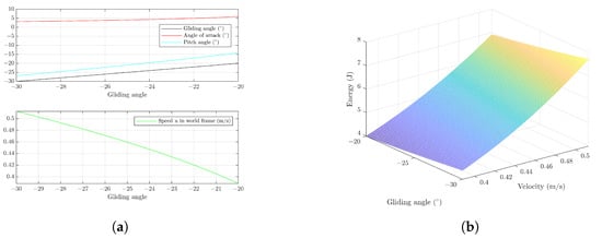 Dynamicmodel simulation. (a) Gliding angle simulation; (b) mechanical energy, gliding angle, and velocity simulation.