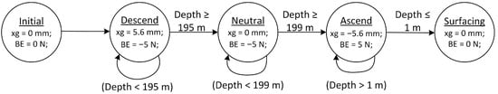 After finding the best gliding angle, a motion simulation was conducted by using the finite state machine in Figure 12. This figure shows a gliding motion from the surface to a depth of 200 m and then returning to the surface again. There are five states, initial, descent, neutral, ascend, and surfacing. The initial state describes the moving mass’s position in the neutral position (0 mm) and the buoyancy engine in a neutral buoyancy position (BE = 0 N). The descent state describes a pitch down position with a moving mass moved to 5.6 mm and the buoyancy engine in a submerged position (BE = −5 N). The neutral state describes the same as the initial state, which is used to eliminate the momentum of the previous state. The ascent state describes the opposite of the descent state, where the moving mass’s position is in a pitch up (moved to −5.6 mm) and the buoyancy engine is in a floating position (BE = 5 N). The surfacing state describes the same as the initial state, where the moving mass and buoyancy engine are set to neutral (BE = 0 N and moving mass position = 0).
