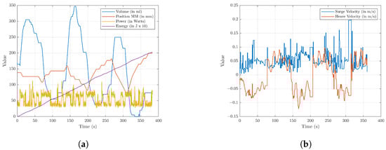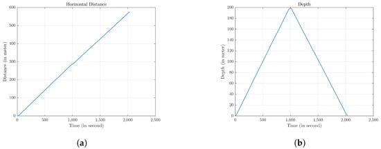 Figure 13 shows the gliding motion simulation using the finite state machine in Figure 12. The horizontal distance travelled in Figure 13a for 2034 s is 575.92 m with a depth of 199.35 m in Figure 13b. Figure 14a shows the pitch in a gliding motion. The maximum pitch for the descent state is 22.01 with a stabilized pitch at 18.26, while for the ascent state, the maximum pitch is 23.46 and stabilized pitch at 18.23. Figure 14b shows the moving-mass engine and buoyancy engine operation in time.